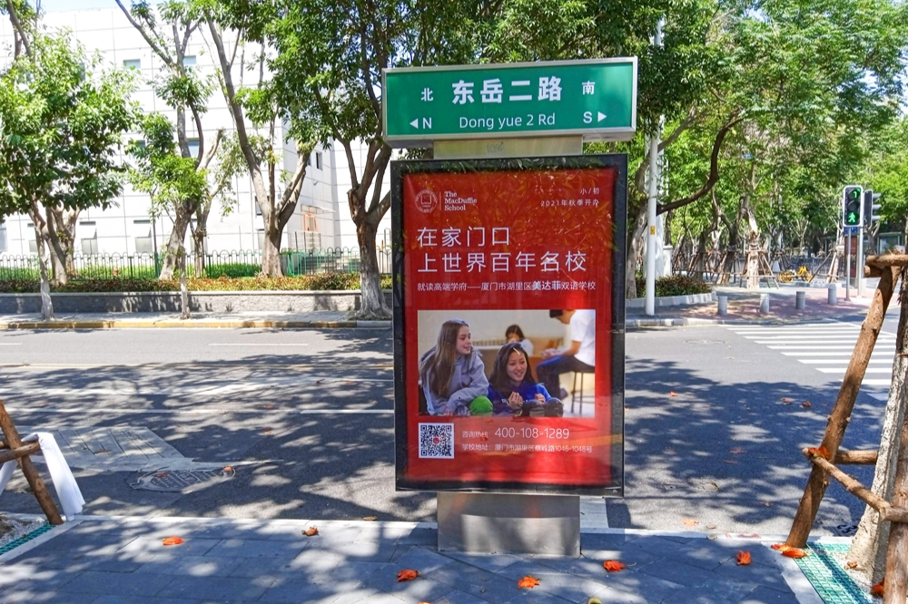 美達(dá)菲在廈門確定扎根后,重視線上線下的一系列宣傳告知,年后即開始在廈門戶外多個(gè)渠道進(jìn)行大范圍的宣傳推廣,以“在家門口,上世界百年名校”為口號(hào),集中在五緣灣、觀音山、會(huì)展、萬達(dá)廣場、蔡塘廣場等多個(gè)中高端商圈、商務(wù)圈,以及仙岳路、廈禾路、嘉禾路等多個(gè)主干道進(jìn)行城市路名牌的投放,同時(shí)在島內(nèi)多個(gè)高端住宅小區(qū)的快遞柜進(jìn)行大幅畫面展示。